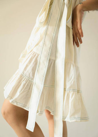 DESCRIPTIONMid length overlap dress, with padded shoulder,   ruffles at the end and stitching detailsABOUT MEFabric: Cotton TwillMade in India.SIZE & FIT:Model wears: XSmallModel's height: 177cm